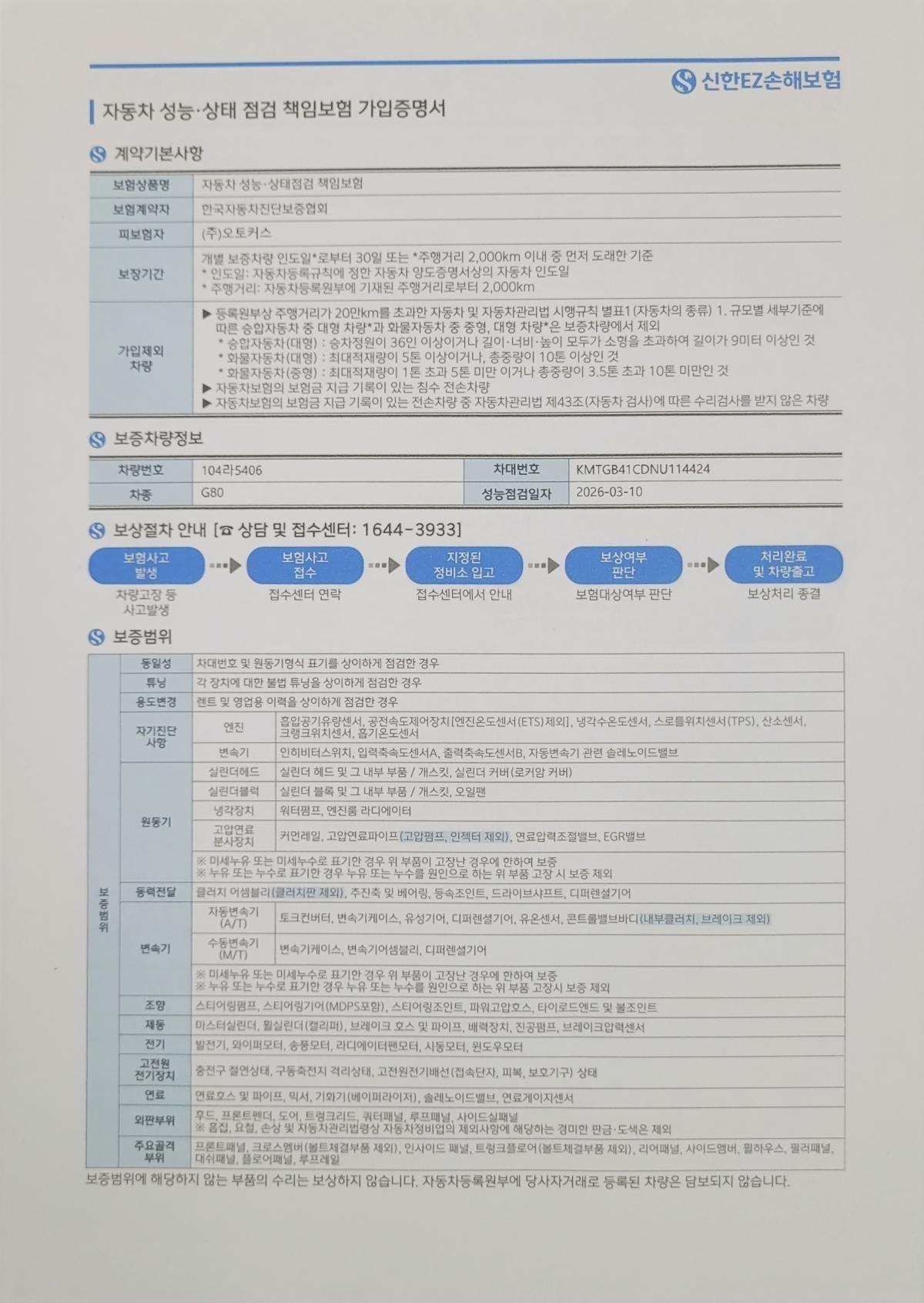 ▶자동차 성능·상태 점검 책임보험 가입증명서