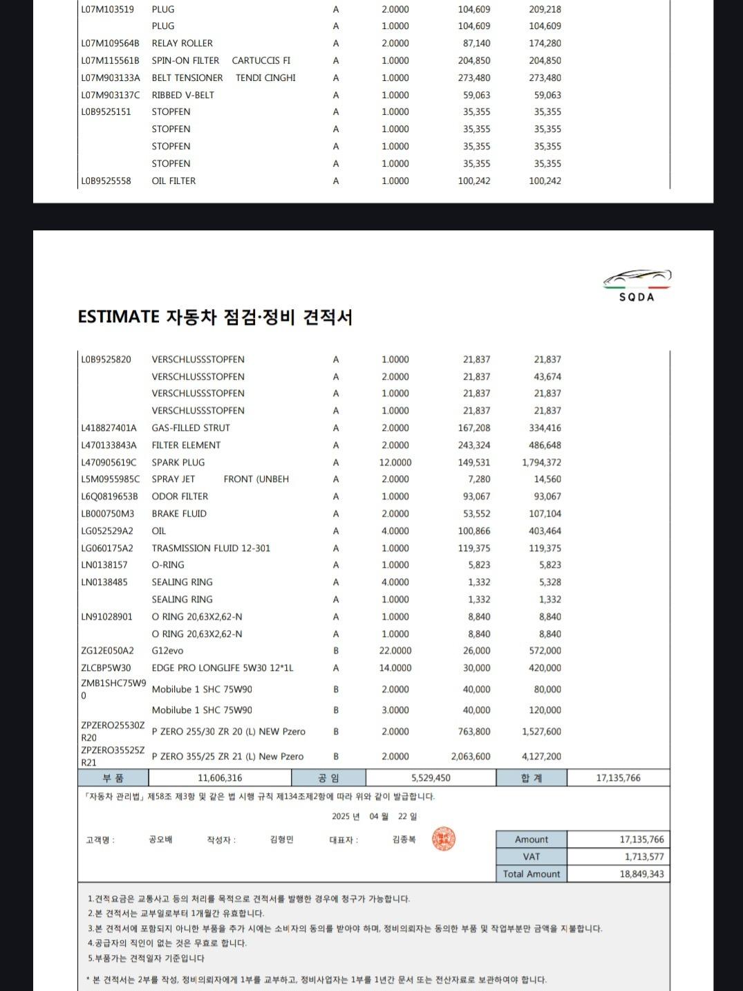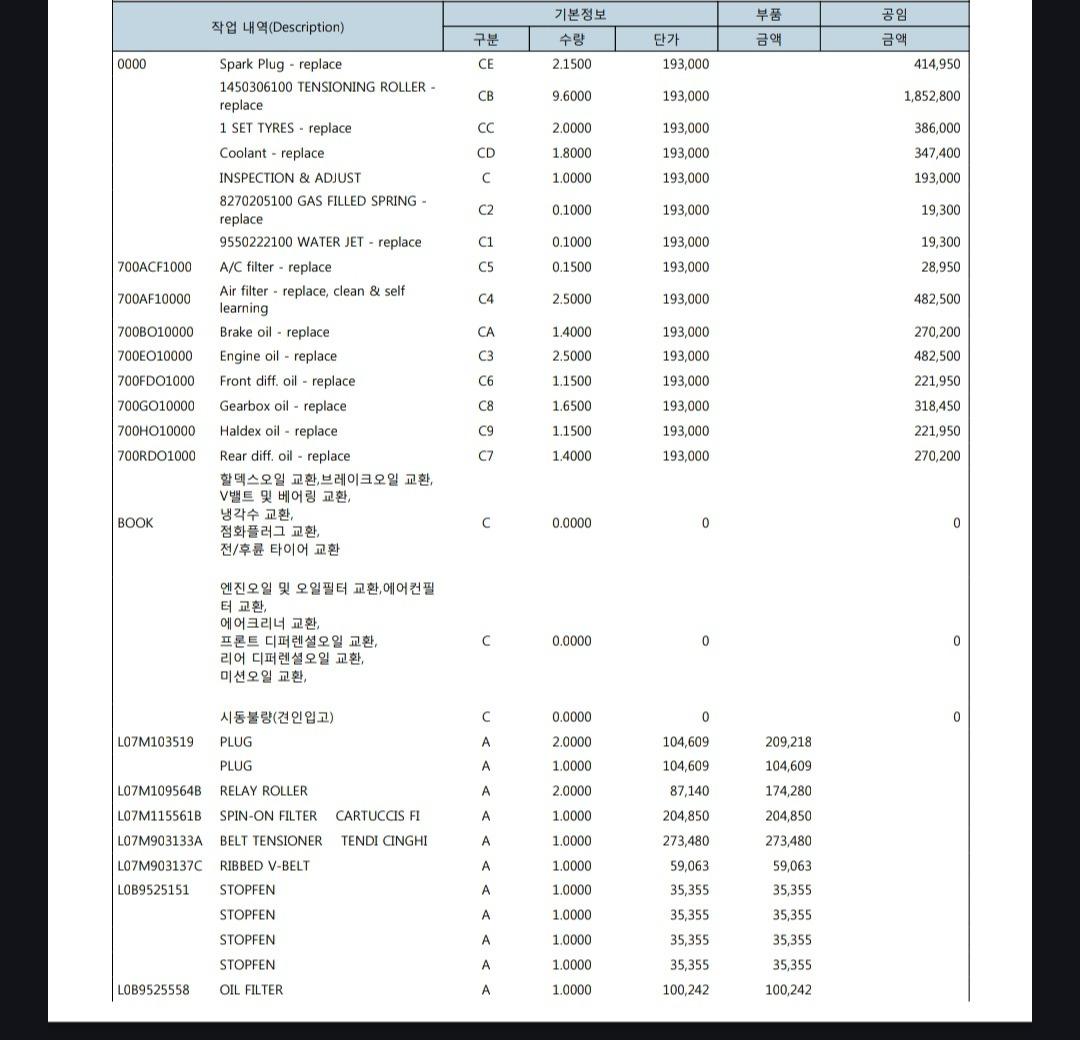 이번에 정식 서비스센터에서 약 2천만 원 상당의 소모품을 모두 교환했습니다.