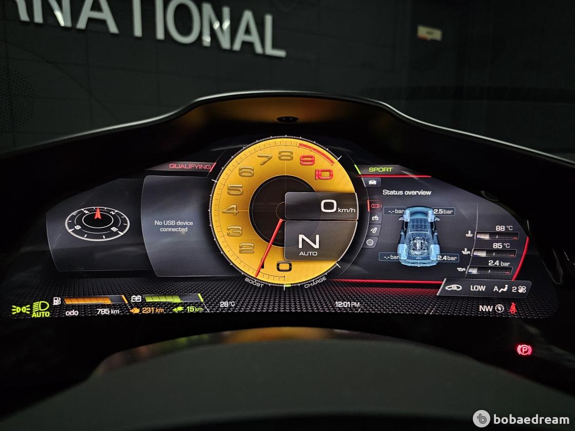 전기 모터와 결합해 830마력이라는 동급 최고 수준의 퍼포먼스를 발휘한다. 시속100km 까지는 2.9초, 200km