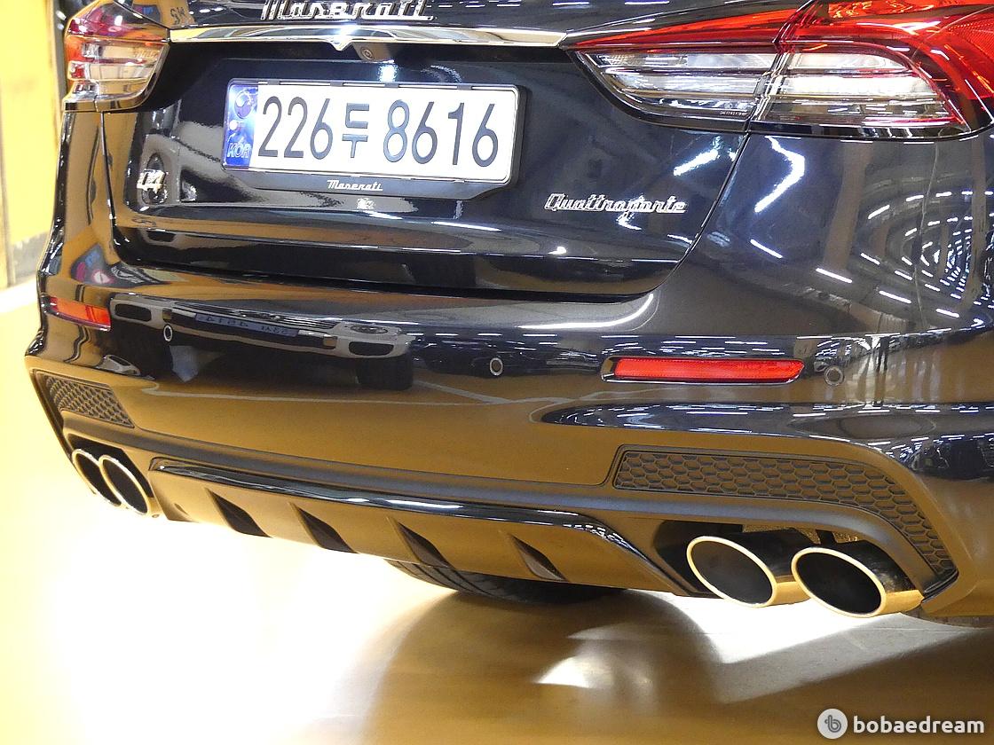 실제 콰트로포르테 모데나 Q4는 큼직한 삼치장 엠블럼을 앞세웠고, 세로의 디테일을 품은 거대한 프론트