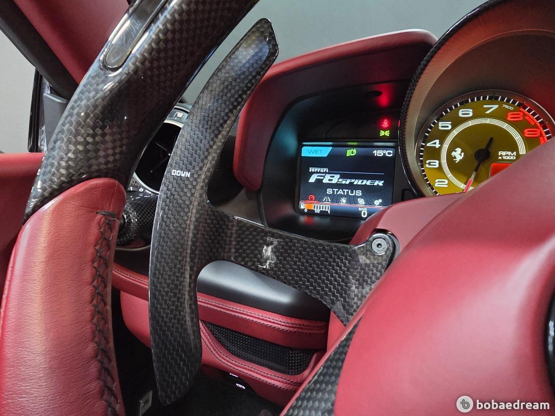 F8 스파이더는 F1 경주차처럼 모든 컨트롤 기능이 신형 스티어링 휠에 탑재된다. 가벼워진 차량을 부각하기