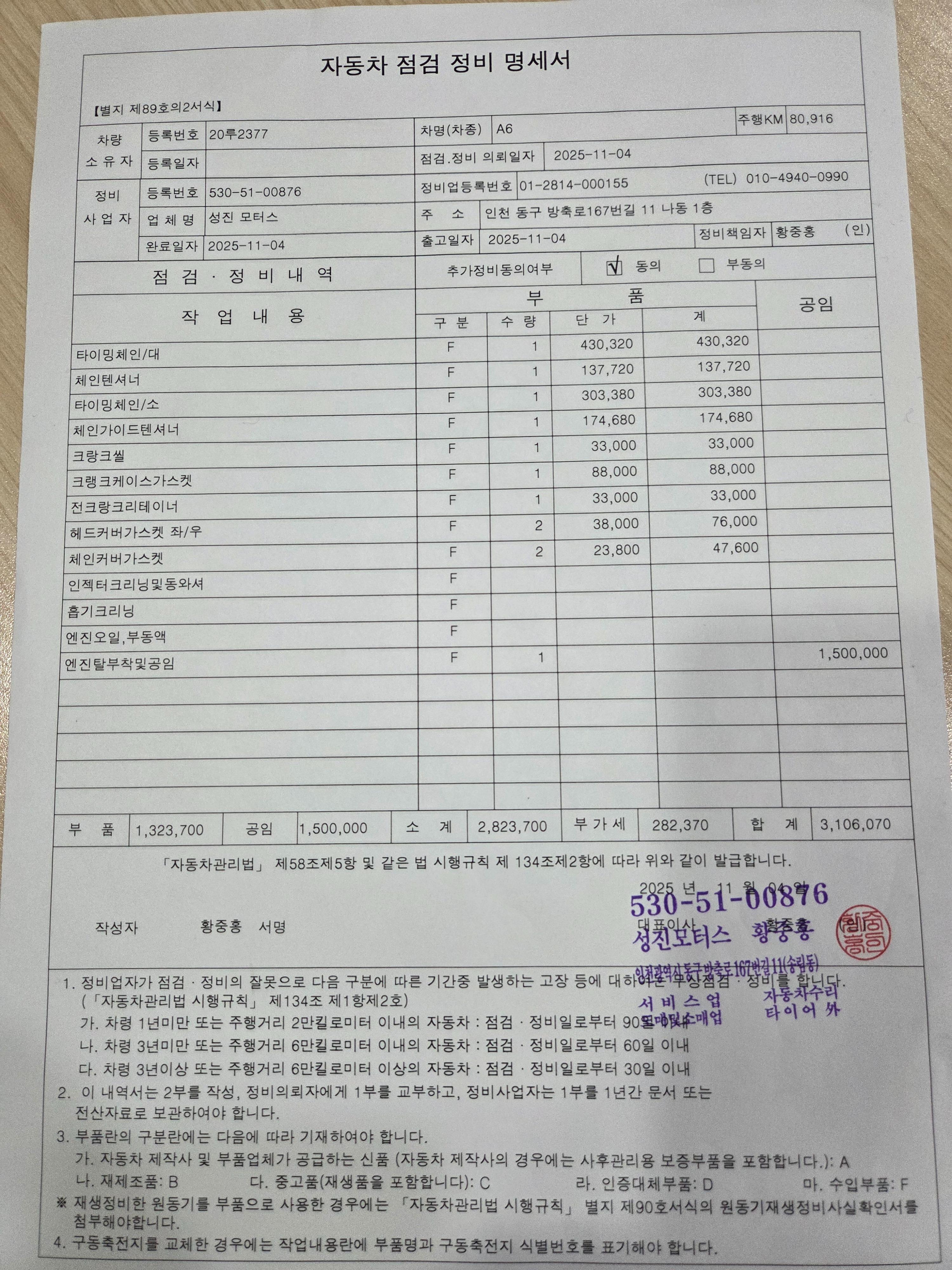 》타이밍벨트 체인 및 오일류 .가스켓 일체 교환 ( 25. 11.4 영수증
