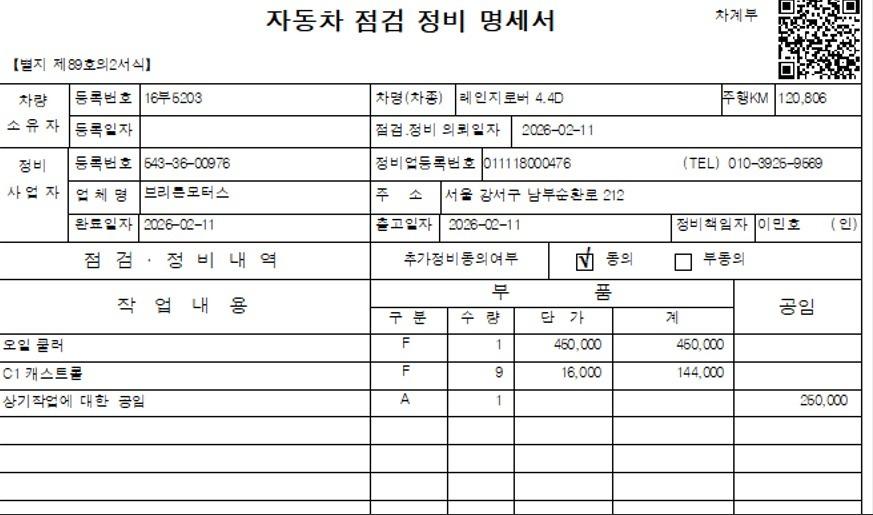 ▶자동차 점검 정비 명세서