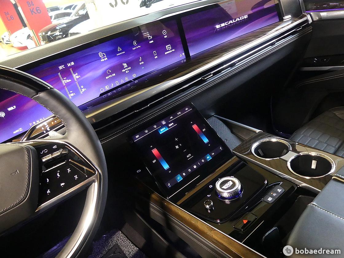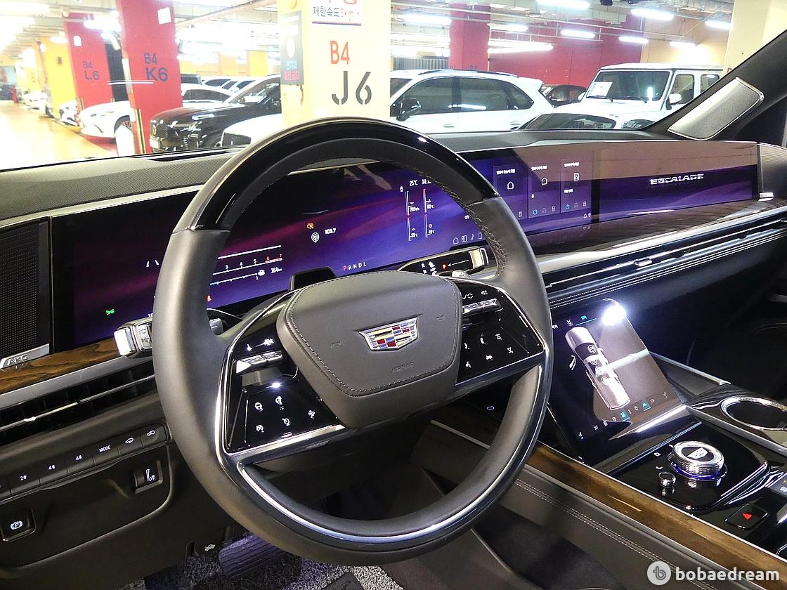 외관은 캐딜락 특유의 디자인 언어를 현대적으로 재해석한 것이 특징이다. 전면부에는 새롭게 디자인된 수직형 LED 헤드램프와 라이팅 시스템이 적용되어 강렬한 인상을 주며, 후면부 역시 대형 블레이드 타입 LED 테일램프를 통해 존재감을 강조한다. 여기에 24인치 대구경 휠이 적용되어 풀사이즈 SUV 특유의 웅장한 비율을 완성했다. 실내에는 필라 투 필라 55인치 커브드 LED 디스플레이가 탑재되어 운전자와 탑승자 모두에게 높은 시인성과 몰입감을 제공하며, 프리미엄 오디오 시스템과 다양한 디지털 인터페이스를 통해 첨단 인포테인먼트 환경을 구현했다.