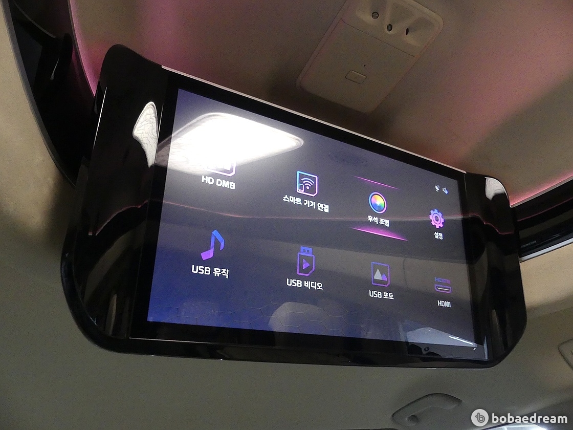 후석 승객의 시야각을 고려해 장착한 21.5인치 스마트 모니터는 지상파 HD-DMB를 비롯해 HDMI단자, USB단자,