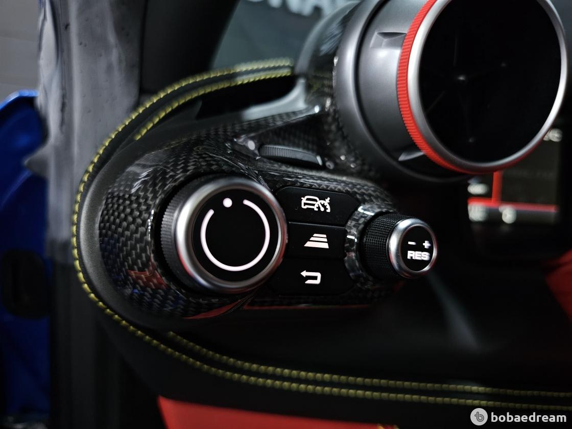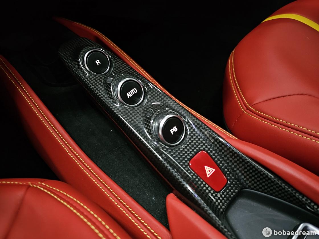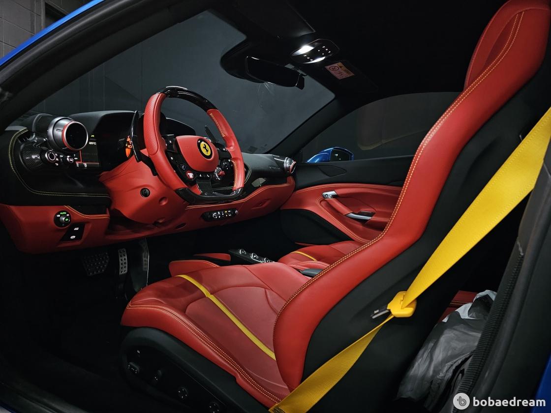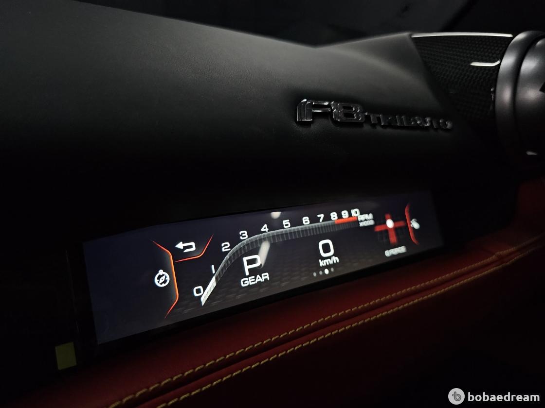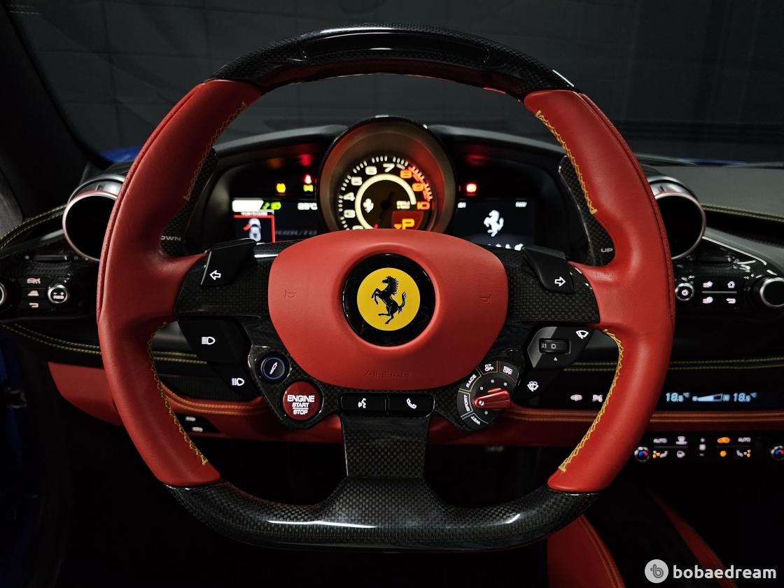 대시보드는 최신 스티어링 휠과 제어장치를 탑재한 페라리 계기판을