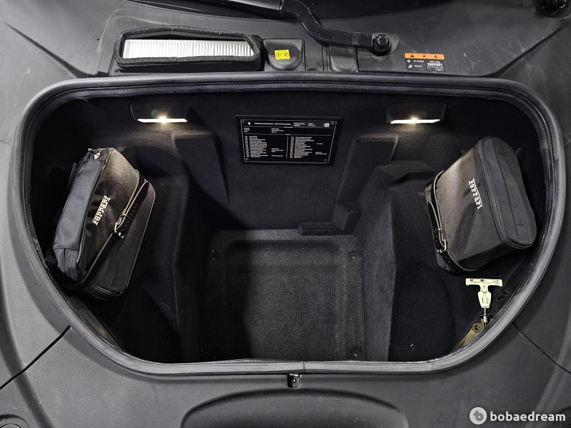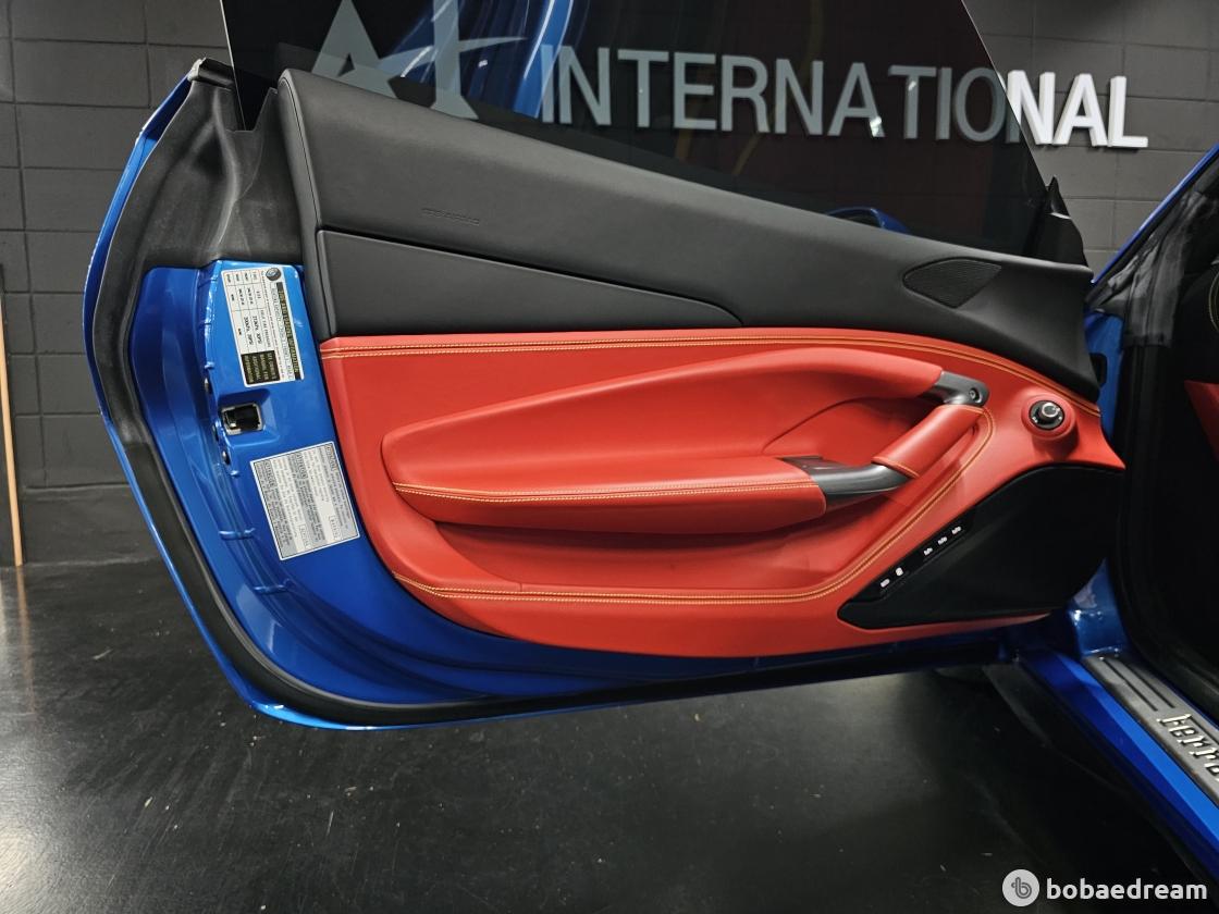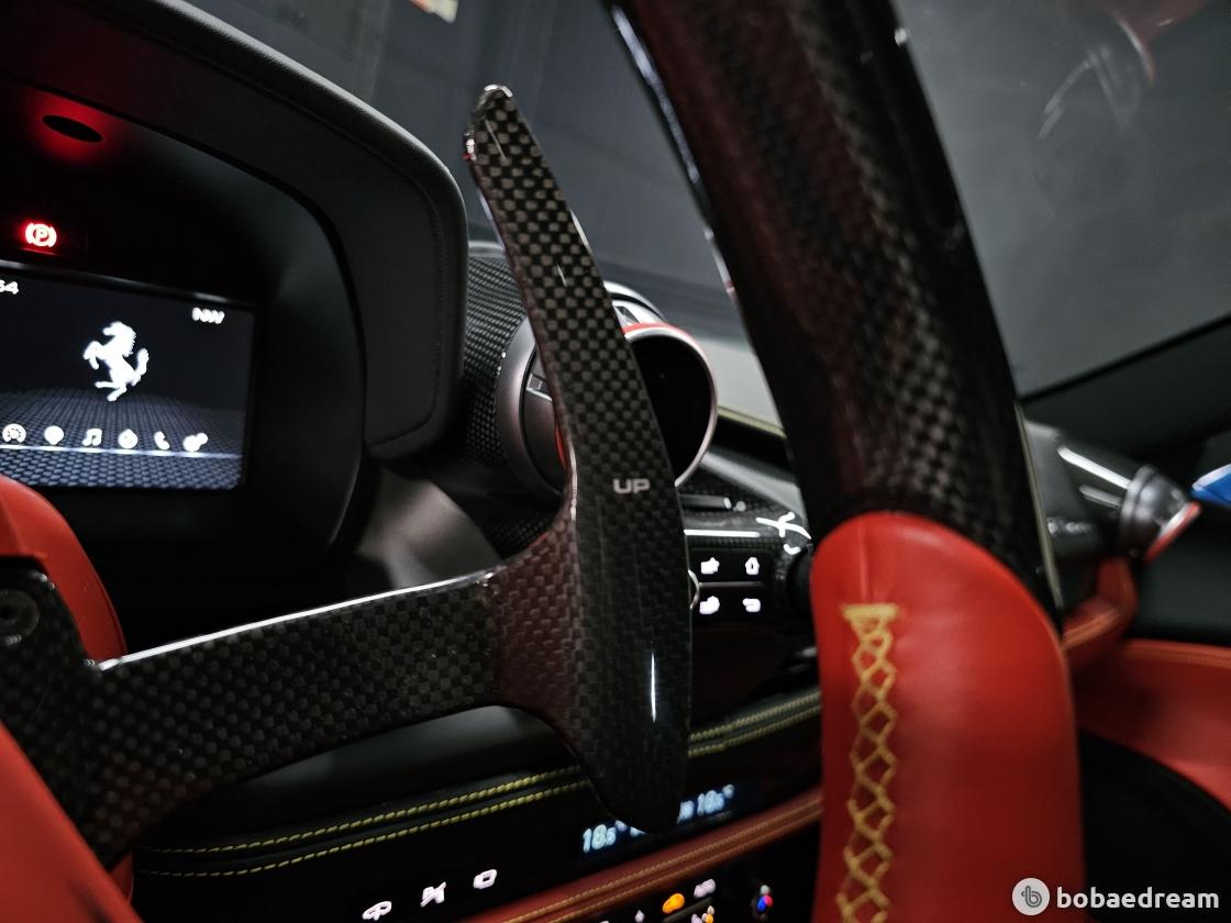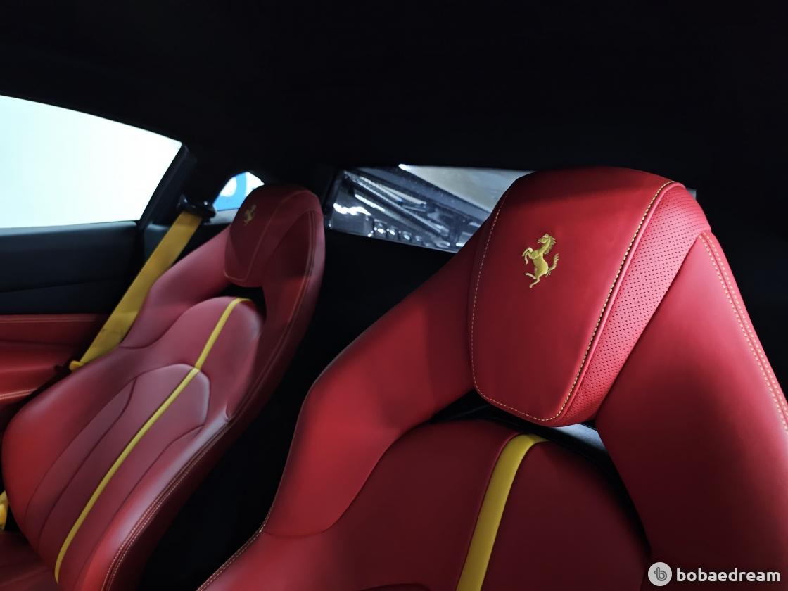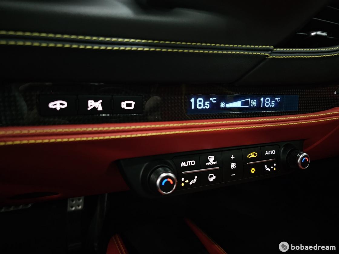 대시보드는 최신 스티어링 휠과 제어장치를 탑재한 페라리 계기판을