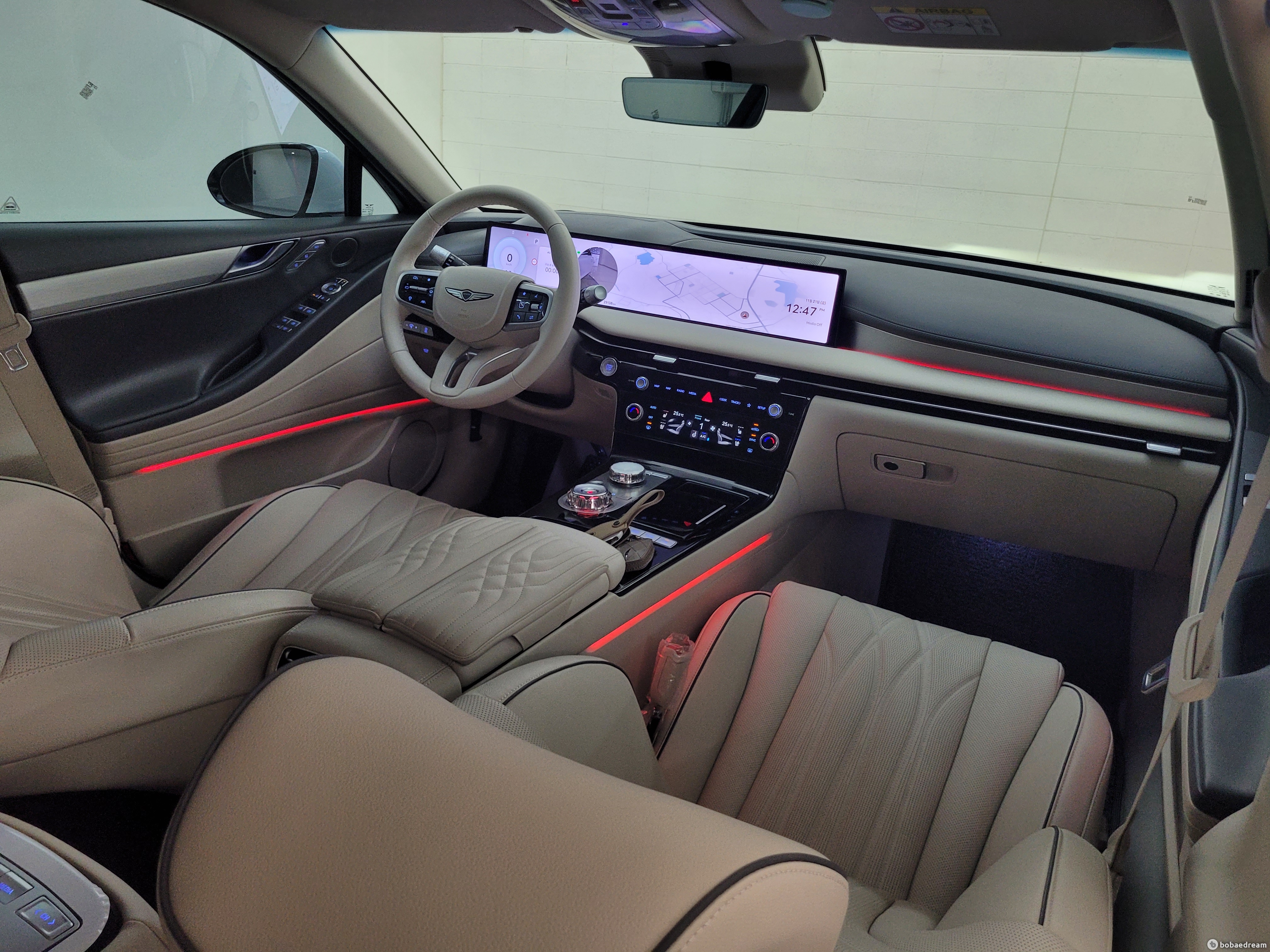 실내는 편안하면서도 깨끗한 느낌을 강조한 수평형 레이아웃에 클러스터와 AVN 화면이 하나로 연결된 27인치