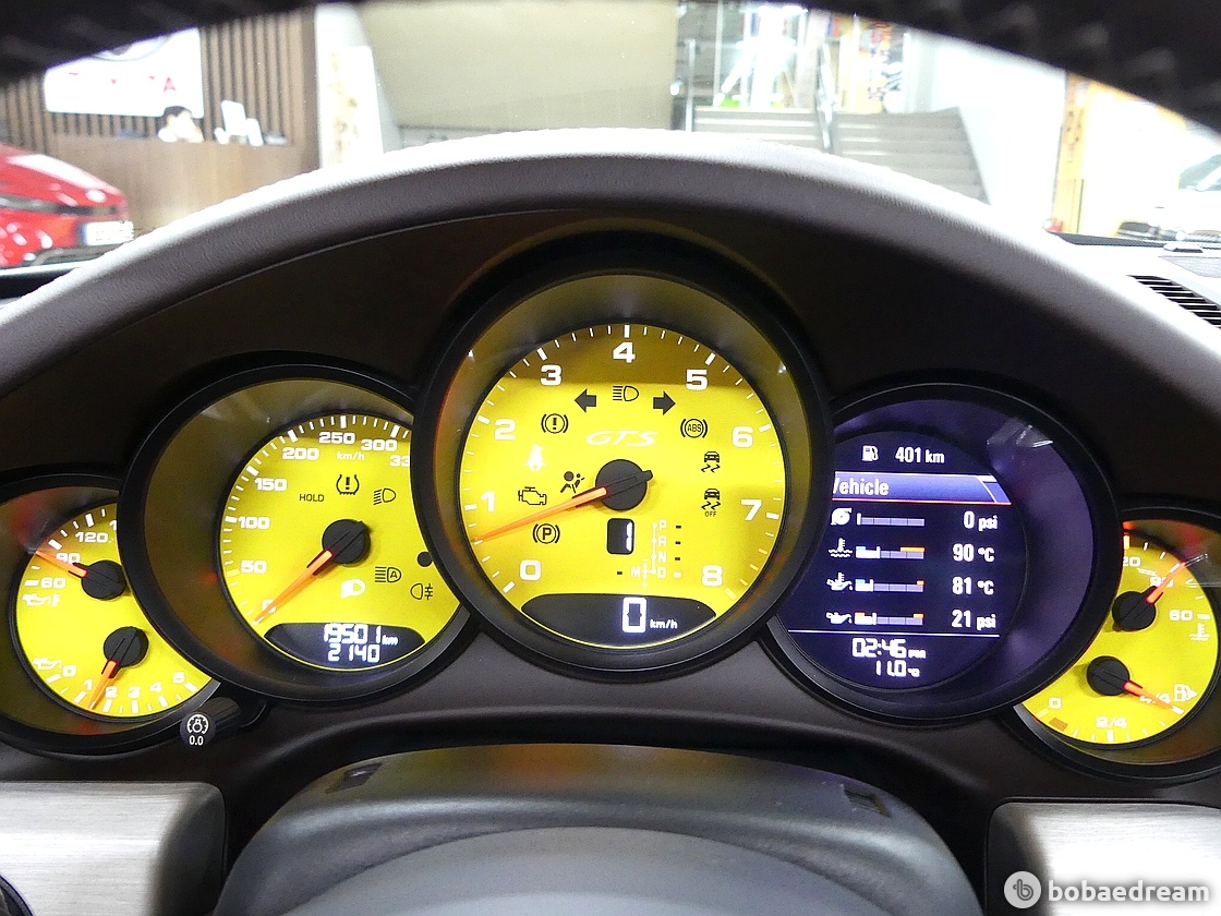 GTS모델의 DNA는 인테리어에도 반영되었다. 스포츠 크로노 패키지의 스톱워치는 대시보드의 중앙구성