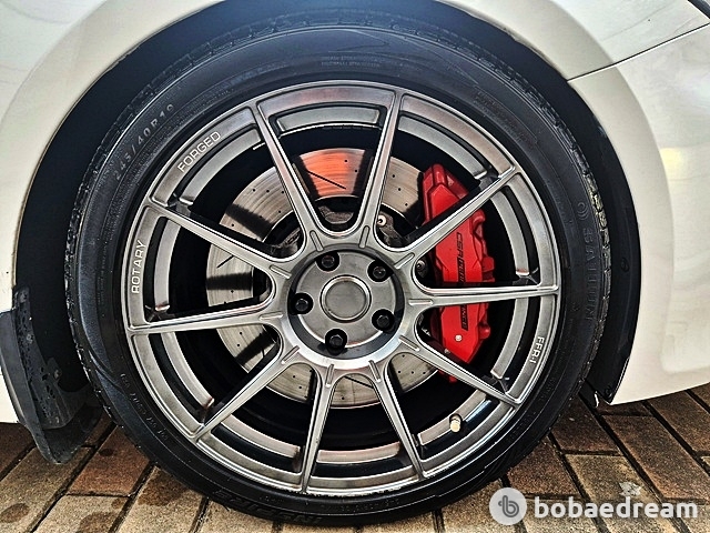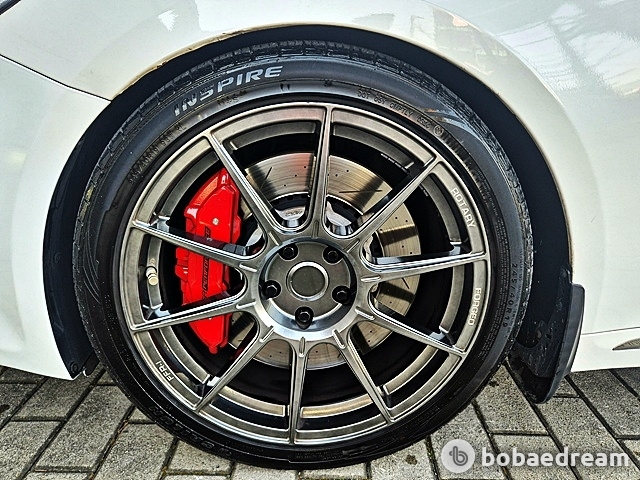 외관은 전후륜 브레이크 적색 캘리퍼, 리어 스포일러와 아웃사이드 미러 블랙 포인트 컬러, 고강성 경량