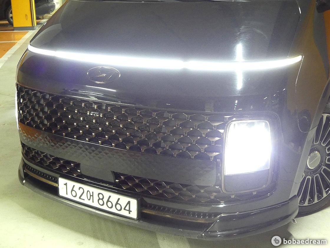 스타리아 일반 모델 전면부는 후드와 범퍼를 가로지르는 얇고 긴 차폭등(포지셔닝 램프)과 주간주행등