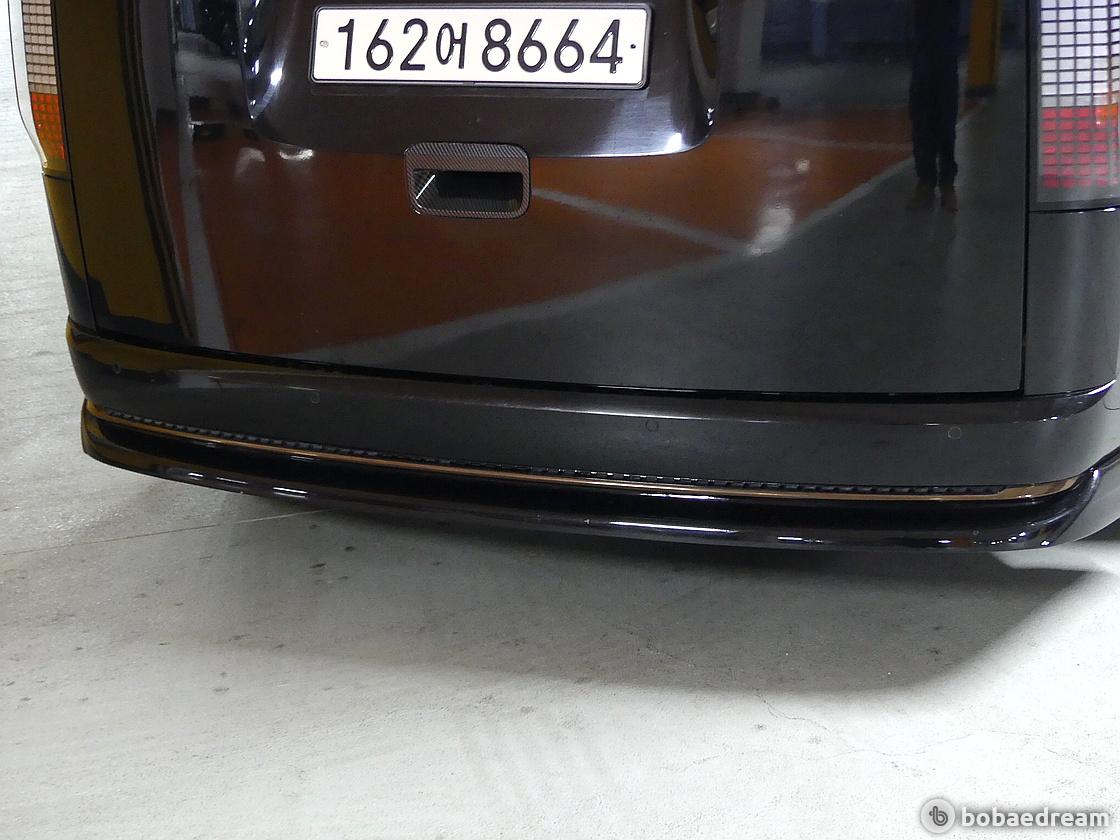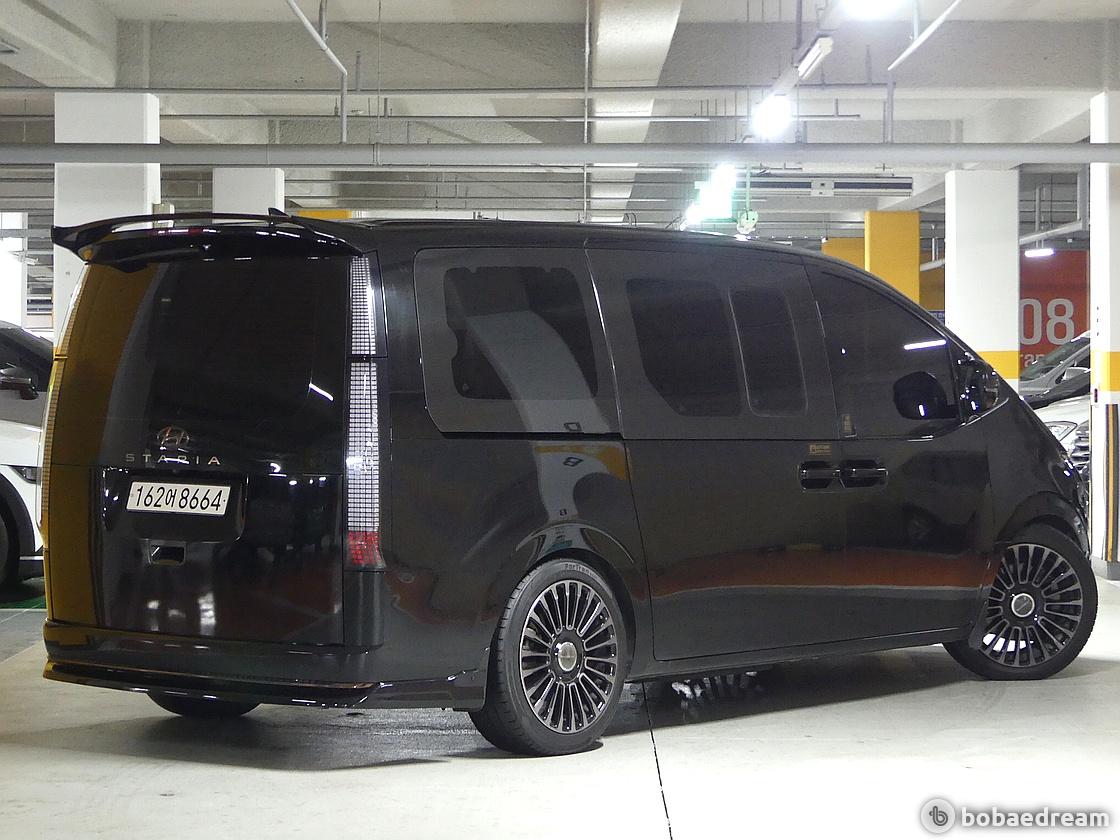 후면부는 간결하고 매끈한 디자인의 수직형 리어램프와 넓은 뒷유리로 개방감을 더욱 강조했다. 스타리아의