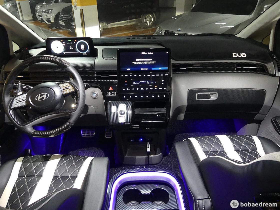 상단에 적용해 하이테크한 느낌을 부여했다. 실내는 스타리아 라운지 전용 다이나믹 웰컴 라이트, 64색