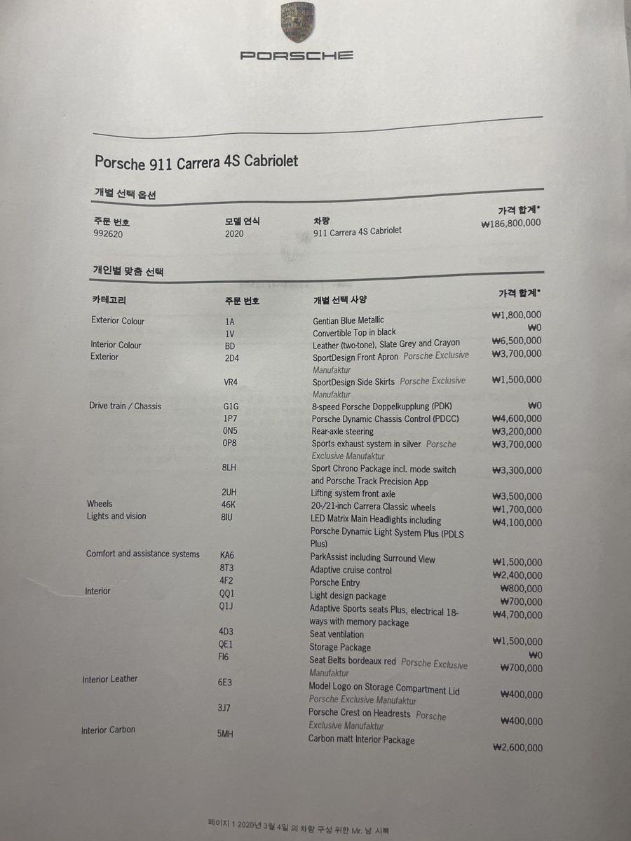 2020년 3월식 포르쉐 911 카레라 4S 카브리올레 모델을 판매합니다.