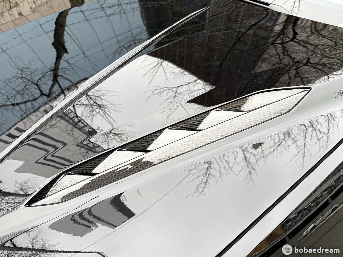 경량 탄소 섬유로 제작됐다. 후드 라인에서부터 프론트 범퍼까지 길게 뻗은 라인에는 공기 배출구가 추가됐다.